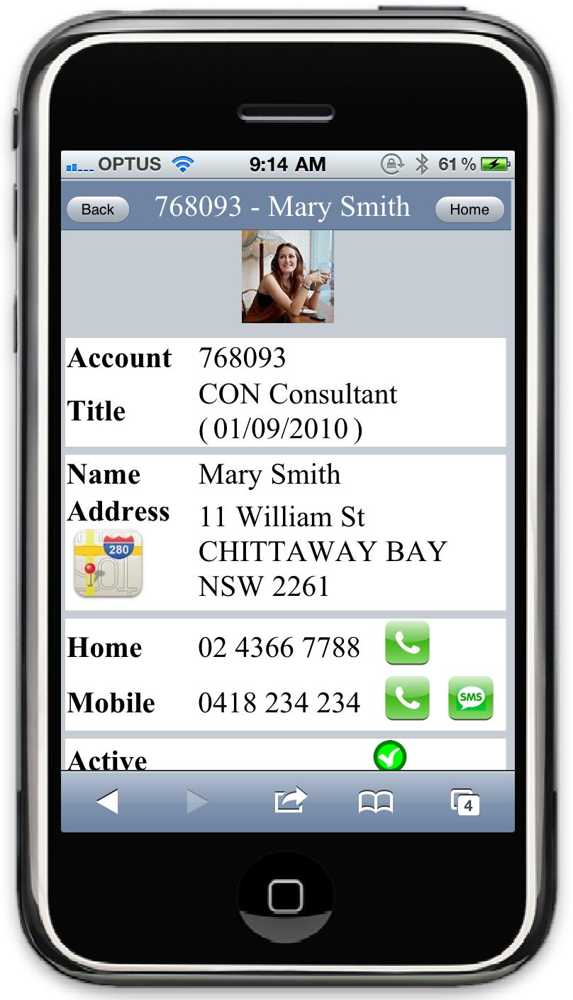 - Contact details for your customers. Tap their phone number to call them, tap their mobile number to text them, tap on their address to show a map.